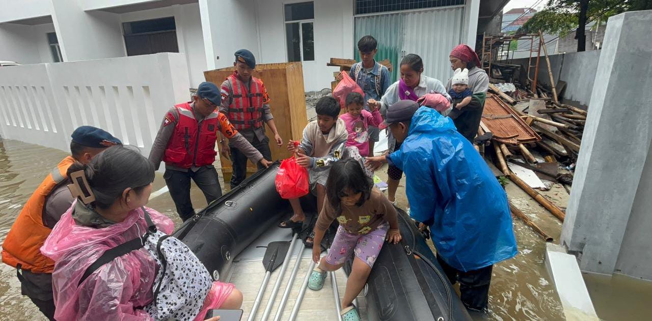 Halo Bekasi; Tangerang – Banjir setinggi sekitar 1 meter merendam kawasan Perumahan Duren Villa, Ciledug, Kota Tangerang, Minggu (8/3/2026) pagi. Tim SAR Batalyon C Pelopor Satbrimob Polda Metro Jaya turun langsung ke lokasi untuk membantu mengevakuasi warga yang terdampak.