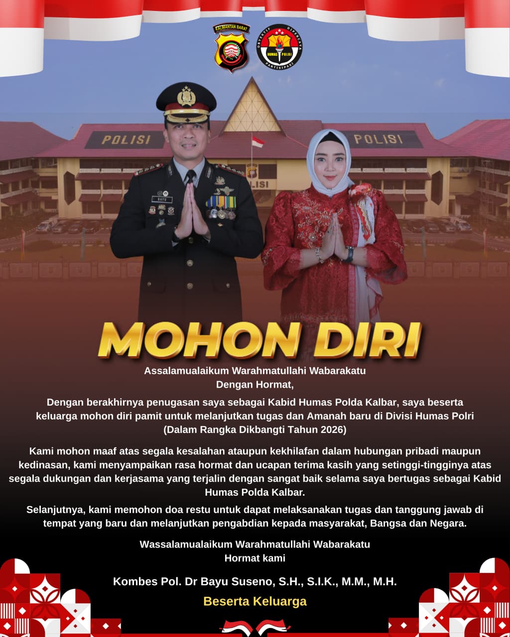 Kombes Pol Bayu Suseno akan mengemban amanah baru di Divisi Humas Polri dalam rangka mengikuti Pendidikan Pengembangan Tinggi (Dikbangti) tahun 2026. Dalam pesan singkatnya, ia menyampaikan apresiasi mendalam kepada seluruh jajaran dan mitra kerja atas dukungan yang diberikan selama ia menjabat.