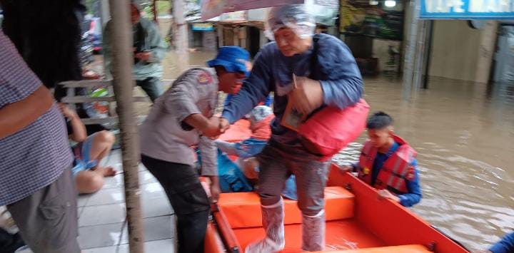 Halo Bekasi; Personel Direktorat Polisi Perairan dan Udara (Polairud) Polda Metro Jaya melaksanakan kegiatan siaga Search and Rescue (SAR) untuk membantu evakuasi warga terdampak banjir di kawasan Pondok Karya, Jakarta Selatan, Minggu (8/3/2026) pagi.