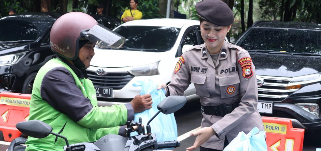 Halo Bekasi; Jakarta – Polda Metro Jaya kembali menggelar kegiatan sosial Jumat Peduli dengan menyalurkan 350 paket sembako kepada pengemudi ojek online (ojol)