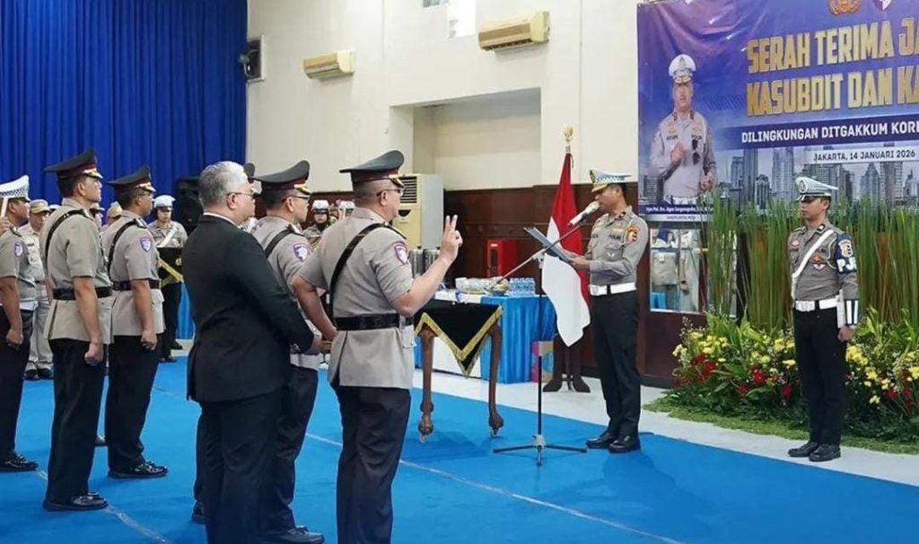 Jakarta – Korps Lalu Lintas (Korlantas) Polri menggelar upacara serah terima jabatan (sertijab) sejumlah pejabat di lingkungan Direktorat Penegakan Hukum (Ditgakkum) Korlantas Polri,