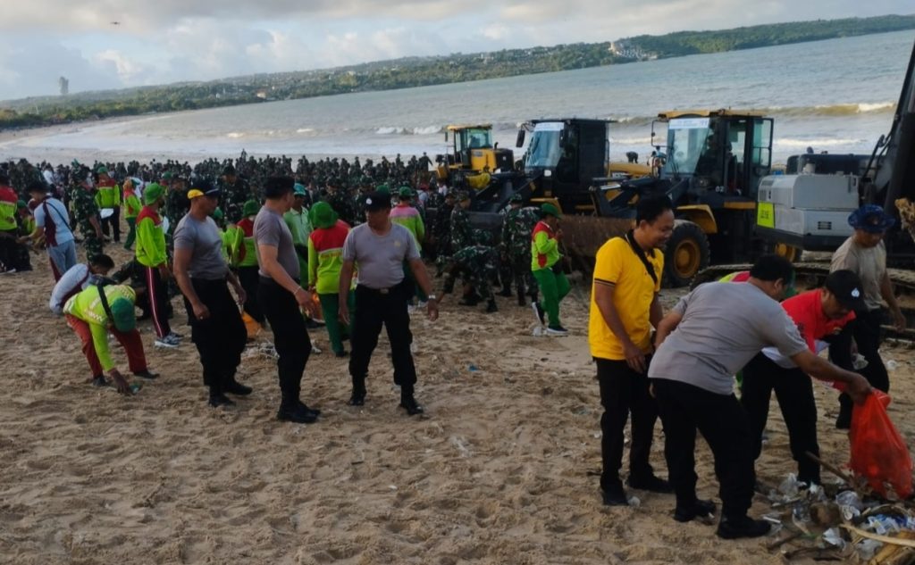 Badung, Bali — Kepolisian Daerah (Polda) Bali bersama TNI dan masyarakat menggelar kegiatan Karya Bakti Pembersihan Pantai dari sampah plastik di kawasan Pantai
