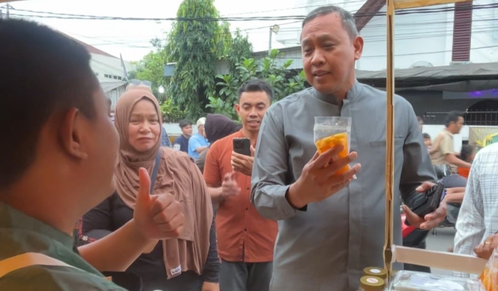 Bekasi – Menjelang waktu berbuka puasa, Wali Kota Bekasi Tri Adhianto mengunjungi lapak takjil yang dikelola siswa-siswi SLB Kembar Karya Pembangunan III di