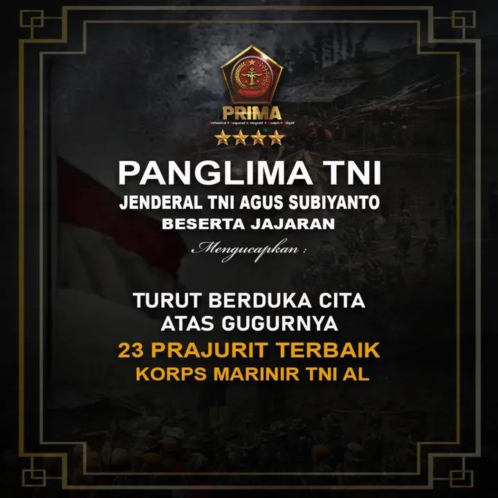 Jakarta – Panglima Tentara Nasional Indonesia (TNI) Jenderal TNI Agus Subiyanto beserta seluruh jajaran TNI menyampaikan duka cita mendalam atas gugurnya 23 prajurit
